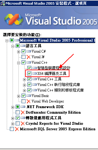 Step1:先檢查一下您的 Visual Studio 2oo5 是否有安裝 X64 的編譯器及工具..